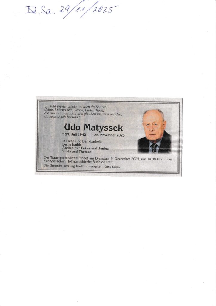 Der Heimatverein Buchloe und Umgebung e. V. trauert um sein Ehrenmitglied Udo Matyssek, der am 25. November 2025 überraschend im Alter von 83 Jahren verstarb.